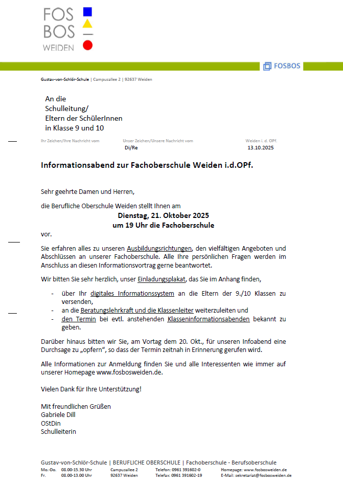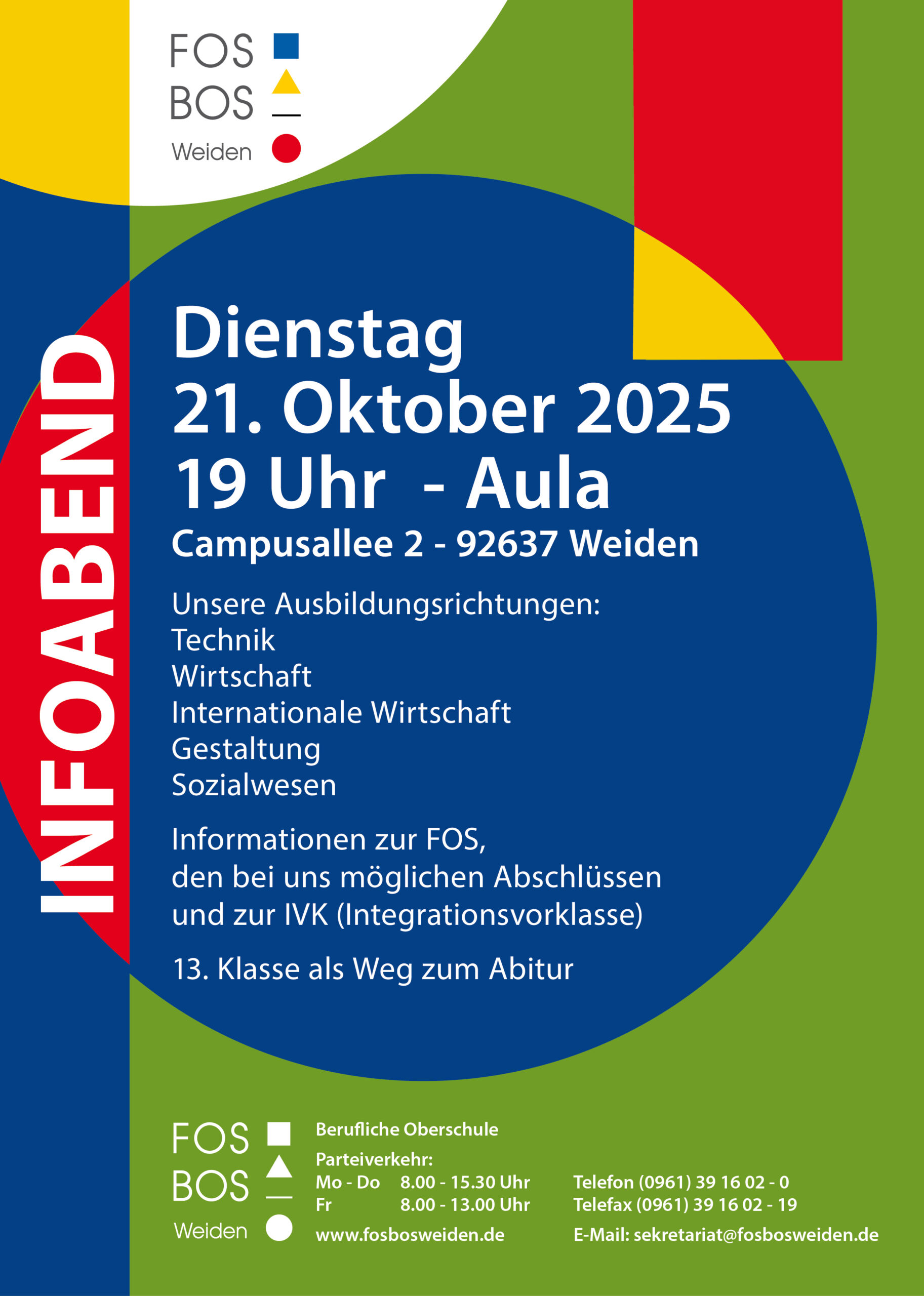 Info Abend FOS Beitrag veröffentlicht:16. Oktober 2025 Beitrags-Kategorie:Neuigkeiten thumbnail_imageHerunterladen Infoplakat 21.10.25Herunterladen Schlagwörter: MGS-Eschenbach Weitere Artikel ansehen Vorheriger BeitragAusbildungsmesse im Vierstädtedreieck Nächster BeitragPapa und ich Das könnte dir auch gefallen Mach dein Handy nicht zur Waffe 14. Oktober 2021 Künstlerin Therese Stock ist Gewinnerin beim Jahres-Familienkalender der Sparkasse 7. November 2024 Hohe Würden an der MGS 13. Dezember 2022